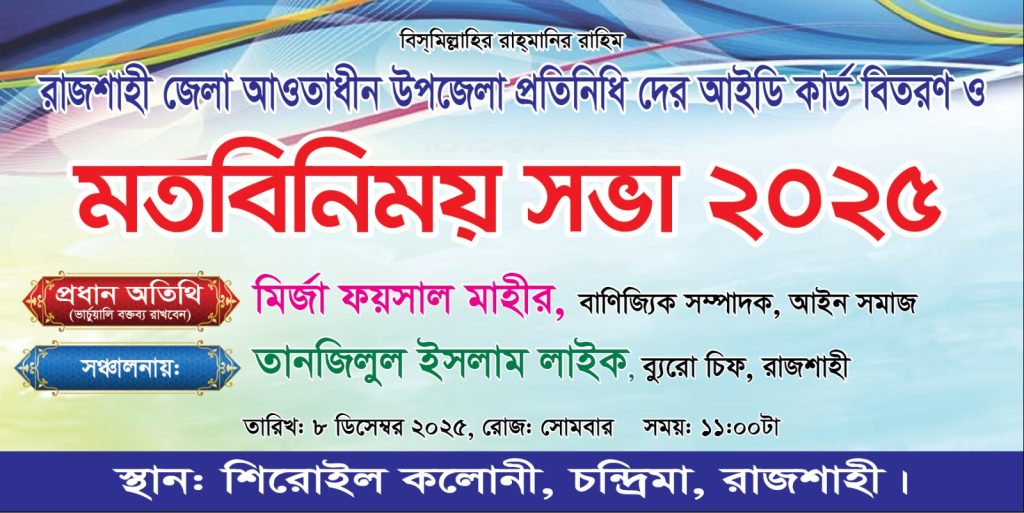 আগামী ৮ ডিসেম্বর ২০২৫ তারিখে রাজশাহী শহরে আইন সমাজ পত্রিকার প্রতিনিধিদের জন্য বিশেষ আইডি কার্ড বিতরণ ও মতবিনিময় সভা অনুষ্ঠিত হবে। অনুষ্ঠানটি পত্রিকার কার্যক্রমের উন্নয়ন ও প্রতিনিধিদের মধ্যে সমন্বয় বৃদ্ধি করতে আয়োজন করা হয়েছে।